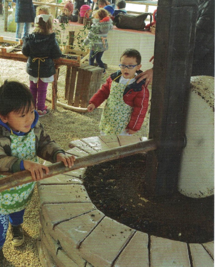 E’ UN PROGETTO DIDATTICO EDUCATIVO VOLTO ALLA CULTURA E AL PIACERE DELL’OLIO D’OLIVA, NONCHE’ AGLI ASPETTI SALUTISTICI DI QUESTO PRODOTTO, A FAR CONOSCERE IL SUO CICLO DI LAVORAZIONE INIZIANDO DALLA RACCOLTA STENDENDO SOTTO LE PIANTE I TELI E DI BATTERE POI CON LUNGHI PALI LE FRONDE DEGLI OLIVI, IN MODO TALE DA FAR CADERE I FRUTTI. CONTINUA IL PROGETTO ILLUSTRANDO I VECCHI MACCHINARI: LA MACINA CON PIETRA DI GRANITO, IL TORCHIO IN LEGNO CON I FAMOSI FISCOLI, LA SEPARAZIONE DELL’ACQUA  DALL’OLIO.