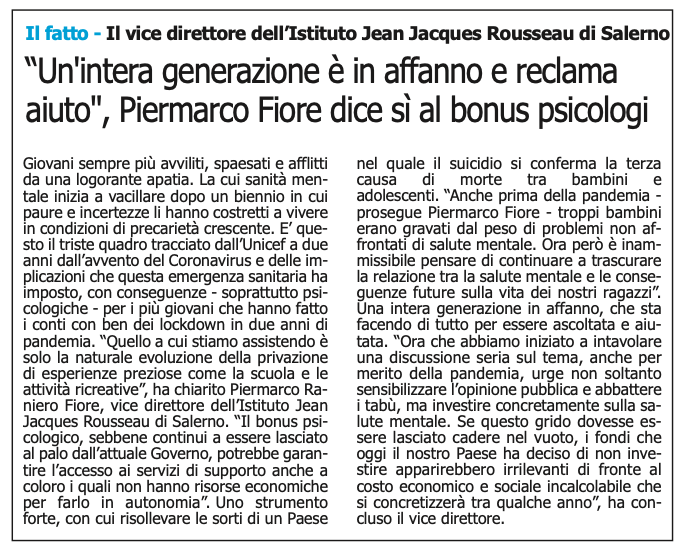 Il vice direttore dell’Istituto Jean Jacques Rousseau di Salerno si rivolge alla politica affinché il bonus psicologico aiuti tante migliaia di adolescenti gravati da un biennio di Covid